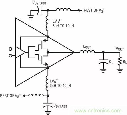 最后一個需要考慮的振蕩源是電源旁路。圖 10 顯示了輸出電路的一部分。LVS+ 和 LVS– 是不可避免的封裝、IC 接合線、旁路電容器的物理長度 (像任何導(dǎo)體一樣也是電感性的) 以及電路板走線的串聯(lián)電感。還包括將局部旁路組件連接到電源總線其余部分 (如果不是電源平面) 的外部電感。盡管 3nH 至 10nH 看起來似乎不大,但是在 200MHz 時(shí),就是 3.8 至 j12Ω。如果輸出晶體管傳導(dǎo)大的高頻輸出電流,那么在電源電感兩端會存在壓降。