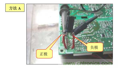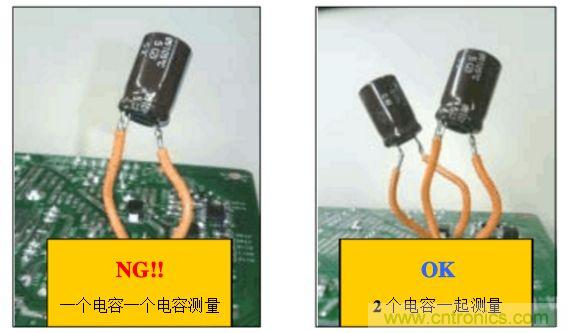 B. 方法(2):在電源板的錫面找出待測電容正負極對應的焊點,焊上兩根導線,然后用電壓探頭夾住引出的導線測試.如下圖: