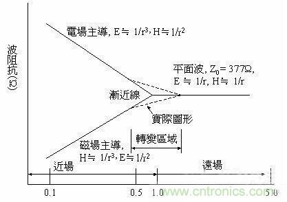 近場(chǎng)(near field)(磁和電的成份)和遠(yuǎn)場(chǎng)的關(guān)系,如附圖一所示。所有的波都是磁場(chǎng)和電場(chǎng)成份的組合。這種組合稱作「PoynTIng向量」。實(shí)際上,是沒有一個(gè)單獨(dú)的電波或磁波存在的。我們之所以能夠測(cè)量到平面波,是因?yàn)閷?duì)一個(gè)小天線而言,在距離來源端數(shù)個(gè)波長(zhǎng)的地方,其波前(wavefront)看起來像平面一樣。