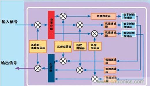 接著,修正的數(shù)字信號轉(zhuǎn)換為模擬射頻信號。通過使用與初始頻率轉(zhuǎn)換同樣的本地振蕩器,這個(gè)信號會被頻繁地轉(zhuǎn)換為接收頻率。降頻轉(zhuǎn)換和升頻轉(zhuǎn)換時(shí),使用唯一的振蕩器保持了信號相位的相干性。