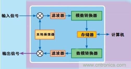 如下圖所示,數(shù)字射頻存儲器可以將接收信號轉(zhuǎn)換為中頻(IF)信號。然后將中頻信號的帶寬數(shù)字化。數(shù)字化信號被存儲在存儲器中傳輸?shù)接?jì)算機(jī)。計(jì)算機(jī)對信號進(jìn)行必要的分析和修正,使其滿足干擾技術(shù)需求。
