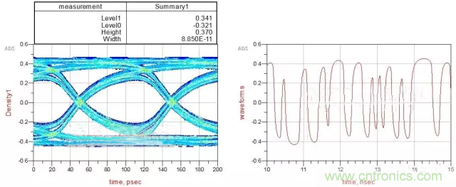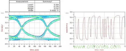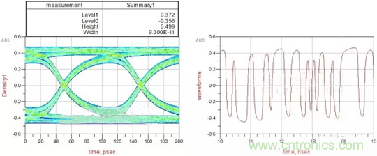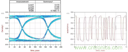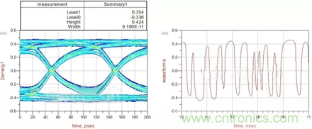 從結(jié)果可以看到:眼圖的寬度為97ps,高度為0.652V,信號(hào)的峰值為0.479V。