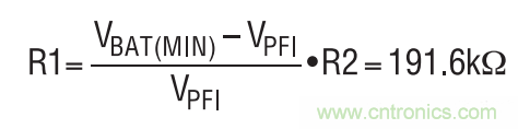 設(shè)計(jì)從設(shè)定 PFI 觸發(fā)電平開始。R2 被設(shè)定為 121k, R1 的阻值應(yīng)把 PFI 引腳上的 PFI 觸發(fā)電平 (VPFI) 設(shè)定至1.2V,其計(jì)算公式如下:
