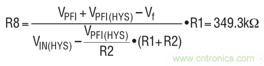VIN 引腳上的遲滯必需延長以滿足 3.6V 的觸發(fā)電平。這可以通過在 PFI 引腳和 PFO 引腳之間增設(shè)一個電阻器與二極管的串聯(lián)組合來實(shí)現(xiàn)。VIN(HYS) 為0.5V,VPFI(HYS)為20mV,而Vf為0.4V。
