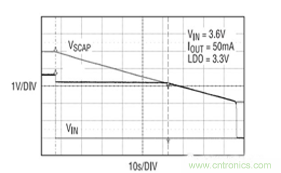 每個超級電容器均選擇為一個由 Nesscap 公司提供的3F/2.7V電容器(ESHSR-0003C0-002R7)。圖 2 示出了在具有一個 50mA 負(fù)載時系統(tǒng)的實(shí)際后備時間。由于在實(shí)際電路中使用了較大的 3F 電容器,因此后備時間為55.4s。