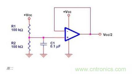 單電源工作的運放需要外部提供一個虛地,通常情況下,這個電壓是VCC/2,圖二的電路可以用來產生VCC/2的電壓,但是他會降低系統(tǒng)的低頻特性。