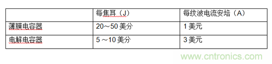 表2:薄膜和電解電容器的成本比較。