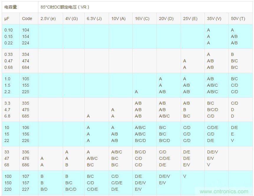 AVX 常規(guī)系列(TAJ)貼片鉭電容:容量和額定電壓(字母表示封裝大?。?/div>