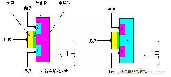 功率MOSFET的內(nèi)部結(jié)構(gòu)和電氣符號(hào)如圖所示,它可分為 NPN型和PNP型。NPN型通常稱為N溝道型,PNP型通常稱P溝道型。由圖1可看出,對(duì)于N溝道型的場(chǎng)效應(yīng)管其源極和漏極接在N型半導(dǎo)體上,同樣對(duì)于P 溝道的場(chǎng)效應(yīng)管其源極和漏極則接在P型半導(dǎo)體上。我們知道一般三極管是由輸入的電流控制輸出的電流。但對(duì)于場(chǎng)效應(yīng)管,其輸出電流是由輸入的電壓(或稱場(chǎng)電壓)控制,可以認(rèn)為輸入電流極小或沒(méi)有輸入電流,這使得該器件有很高的輸入阻抗,同時(shí)這也是我們稱之為場(chǎng)效應(yīng)管的原因。