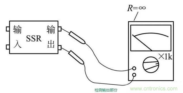 斷開固態(tài)繼電器輸入端的工作電壓后,其輸出端兩引腳之間應(yīng)截止,萬用表表針指示為無窮大。