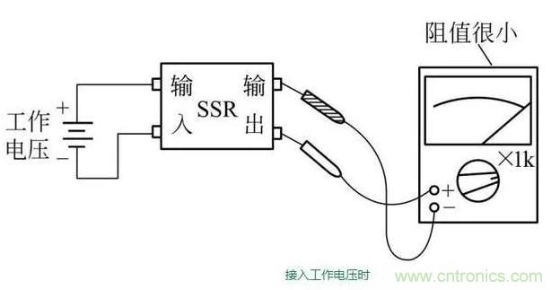 在上一步檢測(cè)的基礎(chǔ)上,給固態(tài)繼電器輸入端接入規(guī)定的工作電壓,這時(shí)固態(tài)繼電器輸出端兩引腳之間應(yīng)該導(dǎo)通,萬用表表針指示阻值很小。