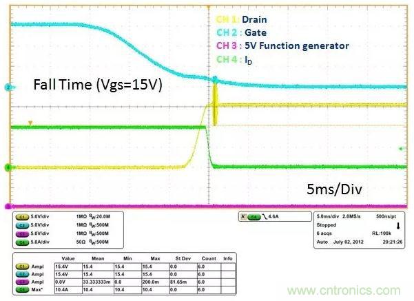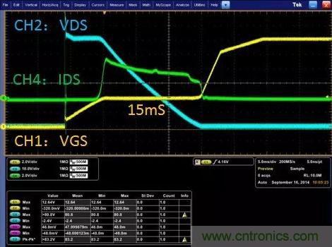 在電池保持板PCM過流關(guān)斷的過程中,從波形可以看到:功率MOSFET同樣也有較長的一段時間工作于線性區(qū)。
