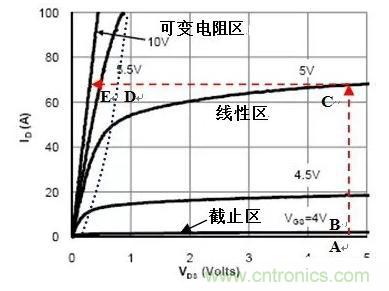 【導(dǎo)讀】功率MOSFET有三個工作狀態(tài),在漏極導(dǎo)通特性曲線上,對應(yīng)的是三個工作區(qū):截止區(qū),線性區(qū)和可變電阻區(qū)。注意到:MOSFET的線性區(qū)有時也稱為:恒流區(qū)或飽和區(qū)。