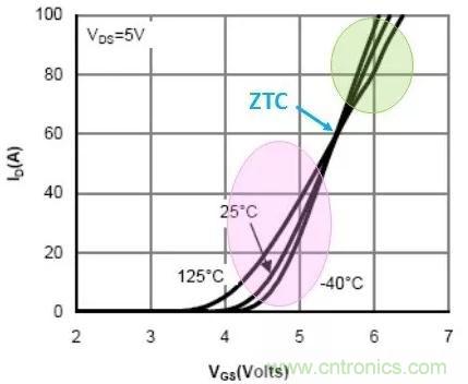 器件的失效處取決于脈沖時間、散熱條件和功率MOSFET單元平衡性能。通常,ZTC對應(yīng)的電流越大,對應(yīng)的VGS越大,就越容易發(fā)生熱不穩(wěn)定性問題。而且ZTC直接和跨導(dǎo)相關(guān),跨導(dǎo)增加,ZTC點(diǎn)向更高的VGS點(diǎn)移動。