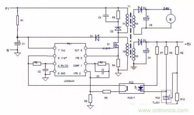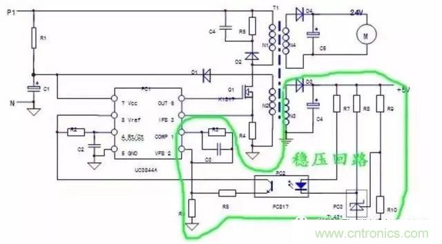 B.對UC3844單獨(dú)上電,短接PC2輸入側(cè),若電路起振,說明故障在PC2輸入側(cè)外圍電路;電路不起振則檢查輸出側(cè)電路。