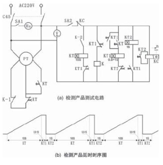 此測(cè)試電路的缺點(diǎn)是:電路較為復(fù)雜,另外對(duì)被測(cè)產(chǎn)品不同的電壓規(guī)格不夠兼容(如被測(cè)產(chǎn)品其它電壓規(guī)定,則需對(duì)此電路需加改進(jìn));每次檢測(cè)產(chǎn)品數(shù)量少(單只產(chǎn)品),延時(shí)記錄需人工對(duì)每次測(cè)試結(jié)果進(jìn)行記錄,并最終對(duì)其記錄數(shù)據(jù)進(jìn)行計(jì)算處理;保持用KT1和休止用KT2兩個(gè)時(shí)間繼電器需根據(jù)產(chǎn)品延時(shí)時(shí)間進(jìn)行相應(yīng)設(shè)置。