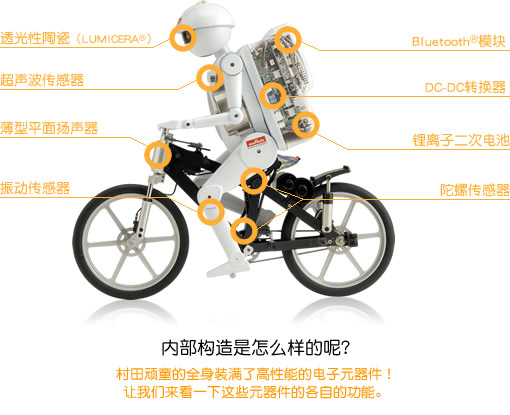 村田制作所在本屆高交會上展示了會騎單車的小機器人——村田頑童,每次演示都吸引了大量觀眾。村田頑童是村田制作所2005年發(fā)布的,至今已經3周歲,但是他那精湛的騎單車技術仍然吸引了眾多觀眾的駐足。