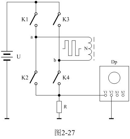 圖2-27中,U是電源電壓,N為變壓器初級(jí)線圈,控制開關(guān)K1、K2、K3、K4組成橋式開關(guān)控制電路,K1和K4為一組,K2和K3為一組,兩組開關(guān)輪流接通與斷開,把電源電壓正反向加于變壓器初級(jí)線圈兩端;R為取樣電阻,通過(guò)測(cè)量R兩端的電壓,就可以知道流過(guò)變壓器初級(jí)線圈的電流;取樣電壓被送到示波器Dp進(jìn)行顯示。