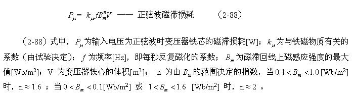 這里順便指出,利用(2-88)和(2-89)式來(lái)分別測(cè)試變壓器鐵心的磁滯損耗和渦流損耗是非常困難的;一個(gè)是它們的系數(shù)很難決定,另一個(gè)是兩者很難分別進(jìn)行測(cè)量,或從測(cè)量結(jié)果中進(jìn)行分離。對(duì)比兩式的參數(shù)就可以知道,它們之間最大的區(qū)別是頻率對(duì)損耗的影響程度;一個(gè)是與頻率成正比,另一個(gè)是與頻率的平方成正比。