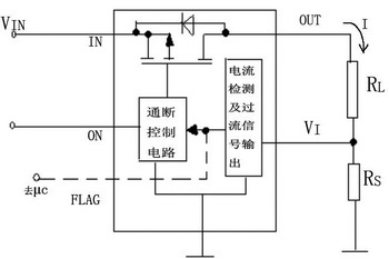圖2是一種帶過流保護的負載開關結構框圖,圖2中,RL是負載,RS是電流檢測電阻。流過RS的電壓降VRS與電流I成比例,此電壓VRS輸入負載開關VI端。若內部電流檢測電路檢測出有過流狀態(tài),輸出過流信號(電平信號)給通、斷控制電路,關斷負載開關。