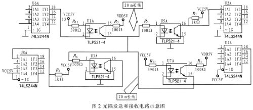 采用光電隔離器TLP521-4對發(fā)送和接收設(shè)備進(jìn)行電氣隔離,對于減小交流阻抗的作用十分明顯,進(jìn)而增大傳輸電流,有效地抑制地線噪聲;同時(shí)由于74LS244N的應(yīng)用??偩€驅(qū)動(dòng)能力得到保障。圖2為光耦發(fā)送和接收電路示意圖。圖2中,上半部兩光耦自左向右傳輸信號,下半部兩光耦自右向左傳輸信號,左端74LS244N通過靜態(tài)存儲器IDT7132與處理器進(jìn)行數(shù)據(jù)交換,右端通過8255與處理器進(jìn)行數(shù)據(jù)交換。