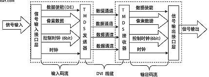 DVI是基于TMDS(TransitionMinimizedDifferentialSignaling,轉換最小差分信號)技術來傳輸數字信號,TMDS運用先進的編碼算法把8bit數據(R、G、B中的每路基色信號)通過最小轉換編碼為10bit數據(包含行場同步信息、時鐘信息、數據DE、糾錯等),經過DC平衡后,采用差分信號傳輸數據,它和LVDS、TTL相比有較好的電磁兼容性能,可以用低成本的專用電纜實現(xiàn)長距離、高質量的數字信號傳輸。TMDS技術的連接傳輸結構如圖1所示。