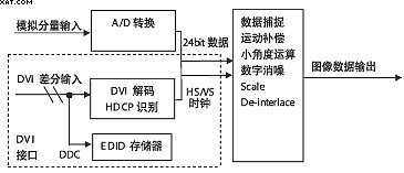 由原理圖看,數字電視增加DVI接口比較簡單,從硬件電路考慮,一是在接口處增加DVI解碼部分,二是在后端提供一個數據通道,如果電視原有方案中具有A/D轉換和相應的后級數據處理通道,那么DVI接口解碼輸出的數據可以與它共用,因為在數字信號格式一定的情況下,其碼率、行頻、場頻、時鐘是一致的。