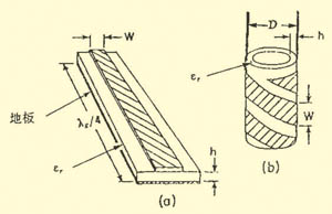 把一體化電視機(jī)視為一種計(jì)算機(jī)以后,只要把全方位螺旋微帶貼片天線直接插入數(shù)字電視機(jī)就能收看電視節(jié)目,在移動(dòng)中接收數(shù)字電視,因?yàn)樾盘?hào)隨地理位置而變化,信道特性作動(dòng)態(tài)變化,這就要求天線對(duì)不同信道的動(dòng)態(tài)特性變化的穩(wěn)定可靠性做出實(shí)時(shí)反映,在移動(dòng)中天線需在全方位范圍內(nèi)保持一定的帶寬和增益。為此我們?cè)O(shè)計(jì)出一種全方位圓柱體螺旋微帶貼片天線,它把1/4波長(zhǎng)的微帶諧振器呈螺旋狀地繞在具有一定厚度(h)的空心圓柱體上,其微帶貼片與地板構(gòu)成同軸圓柱體,體積比較小,可以和任何載體共形(例如汽車),同時(shí)也能設(shè)計(jì)成任何規(guī)格(例如:50Ω,75Ω)的帶線與同軸聯(lián)結(jié)器聯(lián)結(jié),不需要匹配網(wǎng)絡(luò),且空芯內(nèi)部可以安裝有源電子器件。圖1就是1/4波長(zhǎng)全方位微帶螺旋貼片天線的示意圖,(a)是1/4波長(zhǎng)微帶諧振器,(b)是1/4波長(zhǎng)全方位微帶螺旋貼片天線的示意圖。