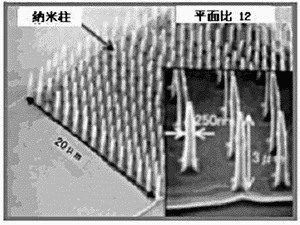 在高寬比納米印刷技術(shù)中,可以簡單地形成直徑為25nm、高3μm(平面比為12)的納米級柱狀結(jié)構(gòu)集合體(見圖2)。該結(jié)構(gòu)在以往的精密塑料成型中是很難形成的,但使用了高寬比納米印刷技術(shù),用一次壓延就能成型。