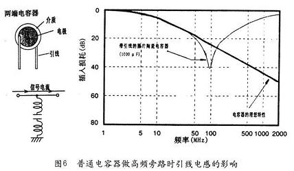 我們平常使用的陶瓷圓片電容器作為旁路電容,可以將高頻干擾短路到地,達(dá)到抗干擾的目的。但是電容器的引線電感及電容內(nèi)部的剩余電感卻限制了它的高頻特性發(fā)揮。圖6是普通電容器做高頻旁路時的引線電感影響例。