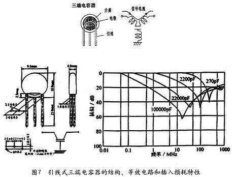 由于普通的兩端電容有引線電感,所以總的剩余電感較大,自諧振點也比較低。為了改進(jìn)普通引線式電容器的自諧振、且自諧振頻率偏低的問題,村田制作所曾發(fā)展了一種引線式三端電容器,見圖7。與兩端電容相比,這個電容的上引線化成了兩根(所以三端電容有三根引線)。三端電容器的這兩根上引線化成了信號傳輸線的一部分,于是引線電感與電容器變成了一個“LC”濾波器。正是三端電容器巧妙地利用了引線電感,使得三端電容器對干擾的抑制作用更好。三端電容器也有自諧振問題,為了最大限度地限制這個問題,使用時三端電容器接地的這根引腳的長度應(yīng)該受到限制。