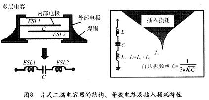 應(yīng)該說片式二端電容器的出現(xiàn)對于改進(jìn)普通引線式電容器的自諧振問題是很有好處的,因為片式二端電容器的引線長度得到了最大限度縮減。但由于電容器內(nèi)部的構(gòu)造,并不能夠消除內(nèi)部電極的殘留電感,這樣當(dāng)頻率達(dá)到使電容器的容抗XC同殘留電感的XL的絕對值相等時,二端電容依然會產(chǎn)生自諧振,參見圖8。由于自諧振頻率的存在,當(dāng)噪聲的頻帶超過自諧振頻率之后,噪聲的抑制效果會急速下降。但是與普通有引線的二端電容相比較,還是有很大改進(jìn)。