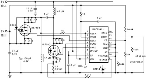 圖1就是一種SEPIC實(shí)用電路,其輸入、輸出電壓均為5V,開(kāi)關(guān)頻率約300kHz,電源變換效率接近90%。其中,UCC39421是一種多用途高效PWM控制器,開(kāi)關(guān)頻率可由其“定時(shí)電阻(RT)”引腳的外接電阻調(diào)整,輸出電壓則取決于“反饋(FB)”端的電壓采樣分壓器,外接N溝道與P溝道MOSFET分別用作功率開(kāi)關(guān)與同步整流。特別值得注意的是,圖中的儲(chǔ)能電感分成對(duì)稱的兩半,輸入端的能量經(jīng)由跨接于兩個(gè)電感之間的電容器向輸出端轉(zhuǎn)移,這是SEPIC電路的主要特征。
