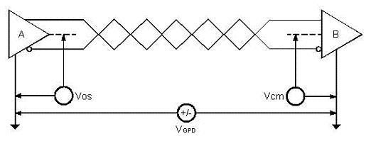 如圖1所示,當(dāng)發(fā)送器A向接收器B發(fā)送數(shù)據(jù)時(shí),發(fā)送器A的輸出共模電壓為VOS,由于兩個(gè)系統(tǒng)具有各自獨(dú)立的接地系統(tǒng)存在著地電位差VGPD,那么接收器輸入端的共模電壓就會(huì)達(dá)到VCM=VOS+VGPD。RS-485標(biāo)準(zhǔn)規(guī)定VOS≤3V,但VGPD可能會(huì)有很大幅度(十幾伏甚至數(shù)十伏),并可能伴有強(qiáng)干擾信號致使接收器共模輸入VCM超出正常圍,在信號線上產(chǎn)生干擾電流輕則影響正常通信,重則損壞設(shè)備。
