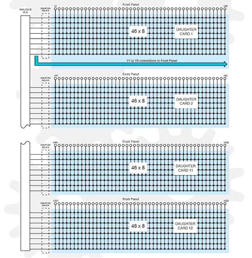 主子板卡決定了Y軸的尺寸,而其他子板卡只是擴展了X軸上的點數(shù)。每個子板卡在Y軸尺寸上必須和主子板卡相同,根據(jù)不同版本的BRIC選擇其他不同的子板卡。BRIC在Y軸尺寸上有4,8,16這幾種標準尺寸,要想獲得其他的尺寸就需要減少板卡上的繼電器數(shù)量即可。除了一個柱上開關(guān)外,可以提供的還有屏蔽的和2個柱上開關(guān)的矩陣形式。
