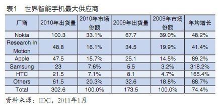 2010年智能手機(jī)獲寵熱銷,世界頂級手機(jī)廠商經(jīng)營冷熱互見,手機(jī)業(yè)老大諾基亞,以及名列三、四的LG和Sony-Ericsson都因未及時趕上智能手機(jī)浪潮而致市占率滑落,RIM、蘋果與宏達(dá)(HTC)等公司看準(zhǔn)苗頭,強(qiáng)勢出擊,傾力經(jīng)營智能手機(jī)而擴(kuò)大了市占率,名列前八的Motorola則又因傳統(tǒng)手機(jī)跌幅太大而致市占率萎縮(見表1)。