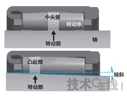 (圖2·噪聲增大的機(jī)制:軸傾斜時(shí),滾動(dòng)體的滾動(dòng)部從中央部向凸起部移動(dòng)。凸起部的精度比中央部低,因此產(chǎn)生不穩(wěn),使得噪聲增大)