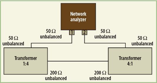 測(cè)量在Advantest的一個(gè)商用VNA,300kHz至3.8GHz模型R3765CG上進(jìn)行。這個(gè)分析儀配有50Ω端接阻抗的非平衡測(cè)試端口。由于寬帶unun阻抗變壓器具有非平衡終端,轉(zhuǎn)換比率為1:4,為了讓該器件與測(cè)試設(shè)備相匹配,需要另一個(gè)轉(zhuǎn)換比率為4:1的器件來(lái)執(zhí)行阻抗轉(zhuǎn)換。圖6和圖7顯示了所有的終端連接。測(cè)試終端和所有用于VNA的線(xiàn)纜都經(jīng)過(guò)校準(zhǔn),以最大限度地減少它們出現(xiàn)錯(cuò)誤的可能性。插損和通帶響應(yīng)利用表示為對(duì)數(shù)幅值形式的傳輸系數(shù)S21來(lái)分析。