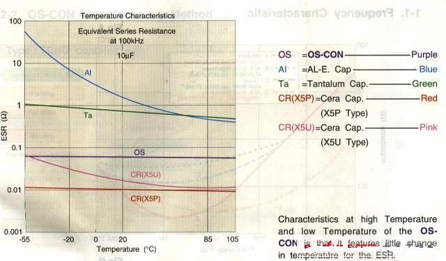 從以上分析我們不難看出,鋁電解液電容的ESR值受溫度影響是極其明顯的。上面的圖表則直接畫出了不同種類電容,在不同溫度狀態(tài)下的ESR曲線。其中鋁電解液電容(藍(lán)色線)隨溫度(Y軸)的增加,ESR值(X軸)降低明顯。而鋁固體聚合物導(dǎo)體電容(紫色線)和鉭電容(綠色線)以及高檔陶瓷電容(紅色線)則近似于直線,其ESR值受溫度影響不大。而普通陶瓷電容(粉紅線)則受溫度影響較大。