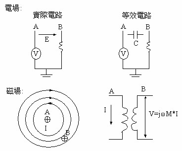 V是電壓,I是電流,R是電阻,Z是阻抗(R + jX),rf是指射頻能量。如果射頻電流存在于PCB走線中,且此走線具有一個(gè)固定的阻抗值,則一個(gè)射頻電壓將被產(chǎn)生,而且和射頻電流成正比。請注意,在電磁波模型中,R是被Z取代,Z是復(fù)數(shù)(complex number),它具有電阻(屬于實(shí)數(shù))和電抗(屬于虛數(shù))。