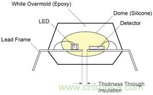 飛兆半導(dǎo)體的 FODM8801 OptoHiT 系列采用專(zhuān)有 OPTOPLANAR® 共面封裝技術(shù)進(jìn)行封裝,這有助于提高低電流下的性能。 圖 2 展示了 OPTOPLANAR 技術(shù)的截面圖。