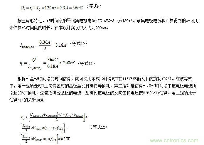 集電極反向恢復(fù)電荷(Qr)數(shù)量可用來估算開關(guān)損耗時間段t3。根據(jù)BJT產(chǎn)品說明書,參數(shù)Qr的計算結(jié)果為36nC。