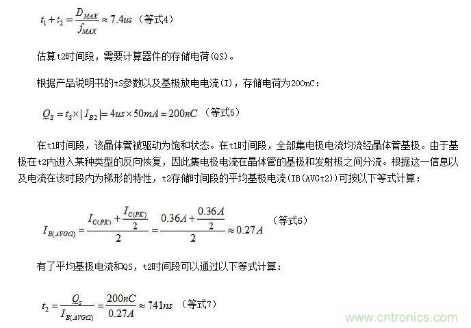 估算晶體管損耗,需要估算圖4中所示的各個時間段。t1時間段是最大占空比的時長,對于本設(shè)計示例而言大約是7.4us。