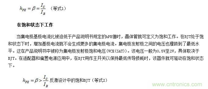 在基極發(fā)射極結(jié)點處于正向偏置,而集電極至發(fā)射極路徑為偏置時,這可打開洪流柵極,允許電流流動。連接至集電極的正偏置會吸引自由電子流向集電極端,在N材料中形成電子匱乏。這可吸引來自基極的電子,將其耗盡在N材料中?,F(xiàn)在電流就可流經(jīng)集電極和發(fā)射極的耗盡層,形成完整電路。集電極電流(IC)的數(shù)量可能會比基極電流(IB)多好幾個數(shù)量級。IC與IB之間的比值一般稱為晶體管的DC電流增益。在產(chǎn)品說明書中也可表達(dá)為Beta(β)或hFE。注意,在晶體管產(chǎn)品說明書中,該比值在特定條件下給出,可能會有明顯的變化。