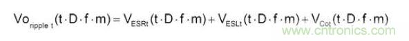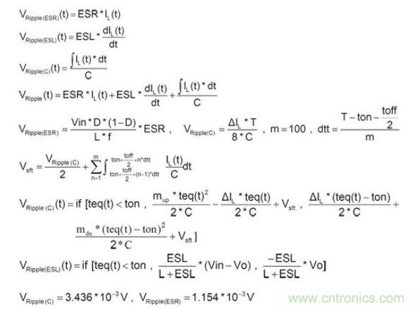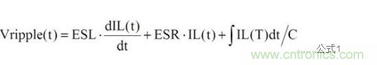 一般而言,在穩(wěn)態(tài)(Steady State)及負(fù)載固定時(shí),輸出電容的紋波電壓主要是由電感的紋波電流造成,可先計(jì)算出電感的紋波電流,再利用歐姆定律,電感微分公式及電容電荷儲(chǔ)存公式,分別計(jì)算出ESR、ESL及Capacitance的紋波電壓。再將此三種紋波加總起來,便可得輸出電容的紋波電壓,如公式1所示: