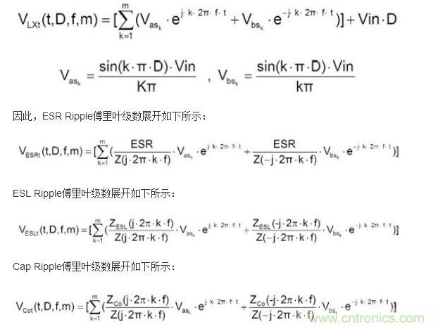 基于此因素,本文將以傅里葉函數(shù)(Fourier Series Expansion)方式來探討同步交換式降壓轉(zhuǎn)換器(Synchronous Step Down Converter)輸出電壓紋波的波形,并依電容完整等效串聯(lián)電阻(ESR)、等效串聯(lián)電感(ESL)、電容值(Capacitance)對(duì)應(yīng)的公式,經(jīng)由理論推導(dǎo),有效地分析電源模塊輸出端紋波成分。