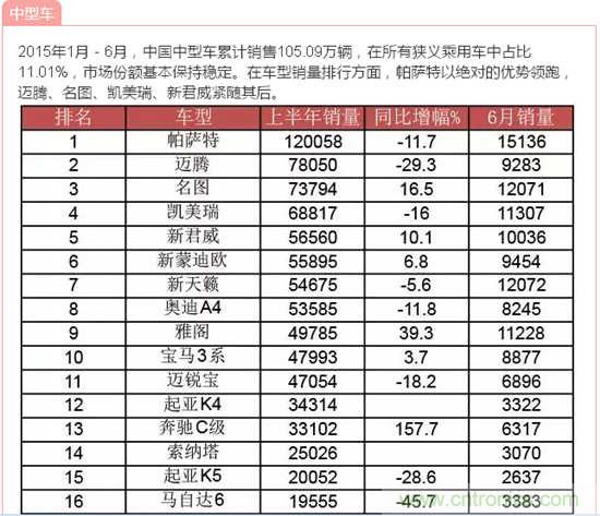 據(jù)中國汽車工業(yè)協(xié)會(huì)發(fā)布的數(shù)據(jù),2015年6月,汽車產(chǎn)銷量環(huán)比下降,同比繼5月后再次雙雙下降;上半年,汽車產(chǎn)銷增速比上年同期明顯回落。說到汽車,小編想到了由我愛方案網(wǎng)承辦的“創(chuàng)業(yè)之星”2015全球創(chuàng)客大賽成都賽場中的一個(gè)參賽項(xiàng)目:智能車載太陽能轉(zhuǎn)化防護(hù)裝置,它改變?cè)扔扇斯ふ周囐M(fèi)時(shí)費(fèi)力方法,完全達(dá)到遙控自動(dòng)罩車,屬于汽車產(chǎn)品領(lǐng)域的一項(xiàng)新技術(shù),歡迎大家到淘方案上了解詳情!下面跟著小編來看看中國汽車在2015年1月-6月的銷量數(shù)據(jù)!歡迎參與互動(dòng)分享!