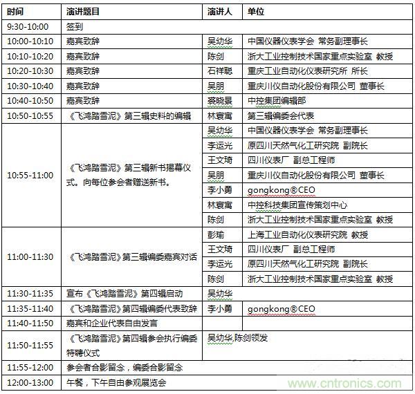 中國儀器儀表學會常務副理事長吳幼華,浙大工業(yè)控制技術國家重點實驗室陳劍教授,重慶工業(yè)自動化儀表研究所石祥聰所長,重慶川儀自動化股份有限公司總經理吳朋,中控集團編輯部裘曉景將分別發(fā)表致辭,闡述中國儀表和自動化的發(fā)展與現狀。林寰寓將代表第三輯編委會與大家分享《飛鴻踏雪泥》第三輯史料編輯的心路歷程,gongkong®CEO李小勇將與吳幼華、李運光、王文琦等專家一起參加《飛鴻踏雪泥》第三輯新書揭幕儀式及嘉賓對話環(huán)節(jié)。李小勇先生還將代表《飛鴻踏雪泥》第四輯編委,發(fā)表致辭,預祝第四輯出版成功!