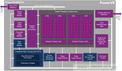 新家族的第一名成員是PowerVR GR6500,基于最新一代的四陣列移動GPU PowerVR Rogue設(shè)計而來,整合了PowerVR Series6 XT系列的所有特性,并加入了強大的光線追蹤硬件加速電路。