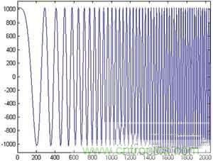 根據(jù)上面的程序,取調(diào)頻斜率為400,頻率控制字為10,幅度量化為10位(和所使用的D/A配合),相位累加器為24位,用Matlab仿真得到的線性調(diào)頻信號的波形和相應(yīng)的幅頻響應(yīng)如圖3和圖4所示。